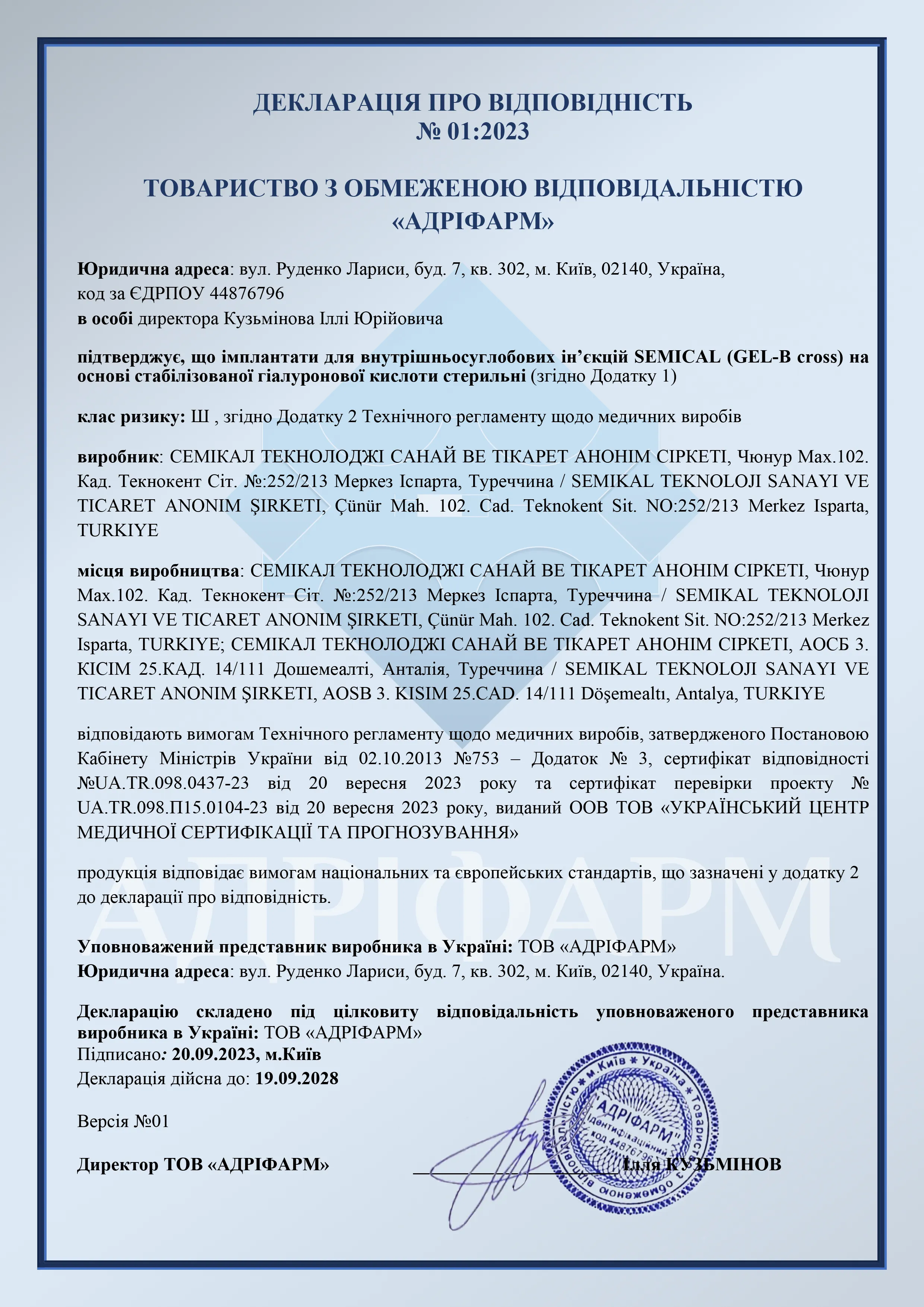 Semical GEL-B CROSS - стерильний, прозорий і в'язкий гелевий медичний виріб, що містить зшиту гіалуронову кислоту нетваринного походження, отриману шляхом бактеріальної ферментації. Використовується для однократного введення